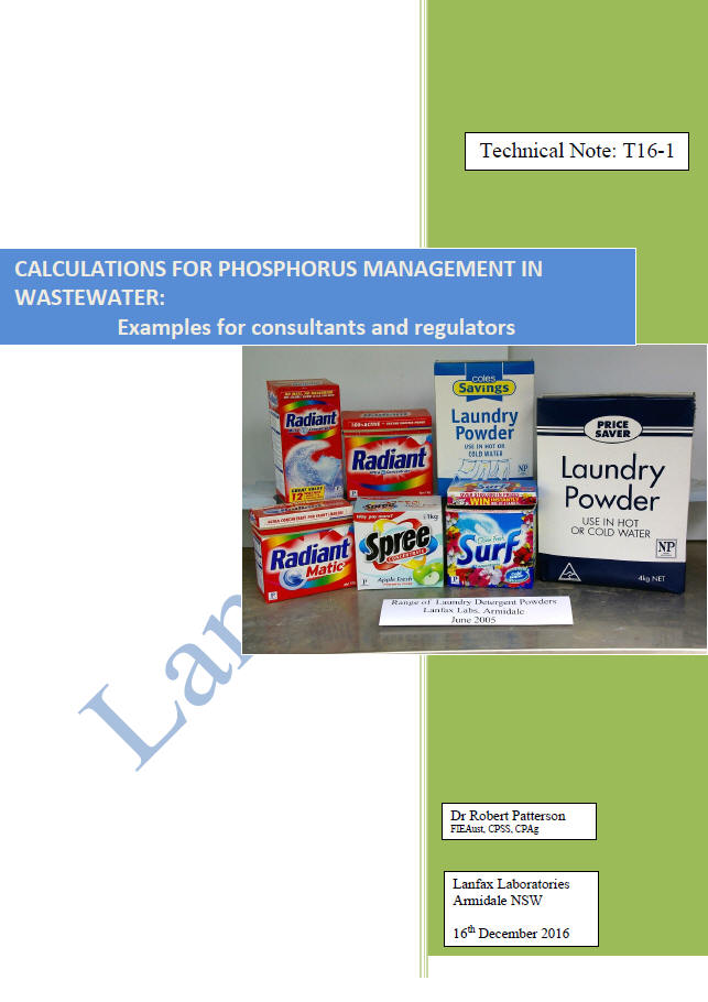 Calculations for phosphorus management in wastewater Let's clear up the spelling of phosphorus - the element, symbol P. With an atomic number of 15 and atomic weight of 30.97, it is one of the non-metals together with carbon, nitrogen, oxygen, sulphur and selenium. It is never found in the pure state because it is highly reactive with air. Most of the chemicals containing phosphorus are 'phosphates' - one phosphorus atom combined with four oxygen atoms as an anion with three spare electrons. The spelling of the reduced form of the element is phosphorous, as in phosphorous acid - that is it is no longer the element having gained one electron. When we refer to compounds of phosphorus, as phosphates or orthophosphates, various P acids and others, it is usual just to use the term phosphorus to include any of these compounds when discussing wastewater issues. ESSENTIAL TO LIFE: We need to understand that phosphorus is an essential element to life (animals, plants and micro-organisms)- generally in the form of phosphate (PO43-), as a transporter of energy, as structural components of all cellular membranes and in bones. Not only do we require a renewal of phosphorus in our diet for the phosphorus we excrete/defecate daily, we also retain phosphorus in our living body for biological and metabolic functions. OUR WASTES: Phosphorus is excreted in urine and faeces at about 1-3 grams per adult per day into our toilet wastewater, from the wastes of food preparation in the kitchen, from detergents in the laundry and from personal care products in the bathroom. All natural foods have some phosphorus while processed foods may have a higher proportion of phosphorus, added as flavouring, preservatives, colour stabilisation and increased self life. Perhaps the best example of an excess of phosphorus is from the carbonated beverage industry where phosphoric acid is used to 'sharpen' the flavour and reduce mould and bacteria growth. REDUCING PHOSPHORUS IN WASTEWATER: While our diet certainly contains phosphorus (in meat, grains and plants), not many households are eager to change their diet to limit phosphorus in wastewater. In the kitchen, reducing the waste in food preparation by removing the food peelings, wasted food, plate scrapings and other sources for disposal to the chooks, or for composting is recommended. In the laundry, the use of low phosphate or no-phosphate detergents, labelled 'P' and 'NP' respectively is quite easy to achieve, since most laundry products are identified as such (refer to phosphorus in laundry products). In the personal care items, labelling does not generally address the issue of phosphates, however, the small amounts in these products are probably not worth the investigation required. PHOSPHORUS IN THE ENVIRONMENT: Phosphorus from wastewater treatment, either on-site systems or reticulated sewerage schemes, that enters natural waterways has the potential to encourage the proliferation of algae and cyanobacteria ('blue-green algae'), which when these decay consume oxygen from the water and suffocate aquatic life. Either chemical removal of the phosphorus or land application of the effluent is required, For the domestic on-site system, the land application area needs to have the capacity to consume the phosphorus, as plant nutrients, or immobilise the phosphorus through natural soil phosphorus sorption properties. The attached document is a technical note discussing the calculations required to correctly size a land application area. It further discusses some of the misunderstandings conveyed in government guidelines that completely confuse an otherwise simple arithmetic calculation.